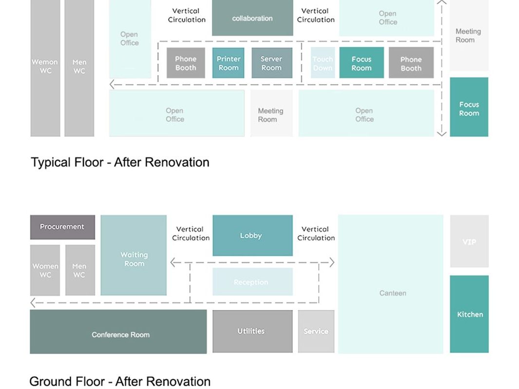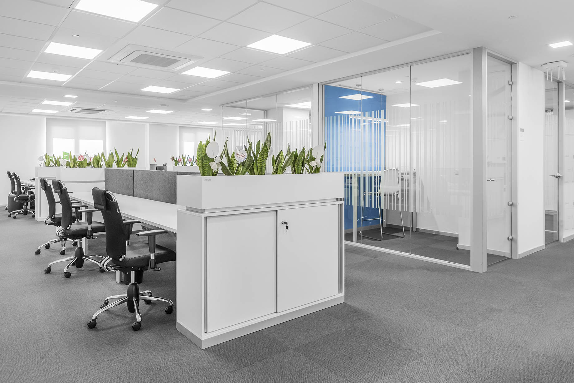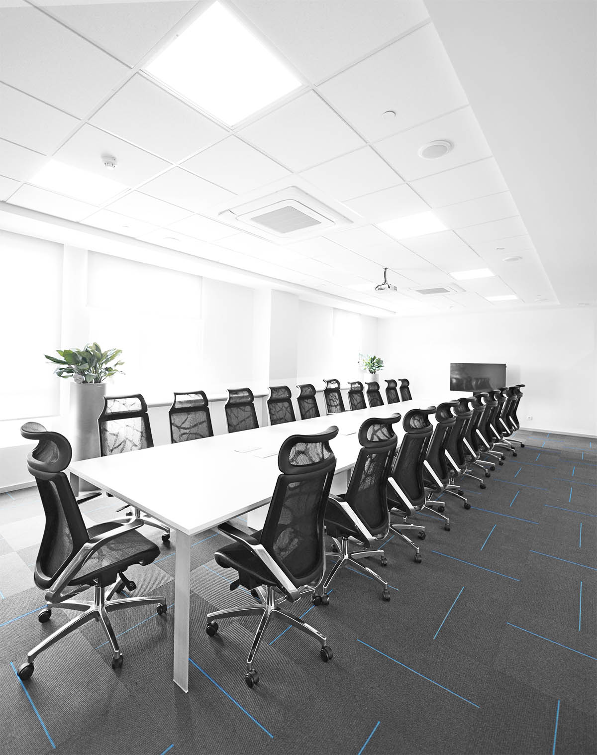 The design maximizes natural light by placing primary workspaces along the perimeter with access to daylight, while support spaces are located centrally. An open-plan layout enhances spatial quality and encourages interaction, supported by a flexible planning approach. A collaboration lounge fosters stronger employee relationships, and ad hoc meeting areas, focus rooms, and small meeting rooms are integrated within the open-plan workspace to provide easy access and create natural pause spaces for both focused work and informal collaboration.