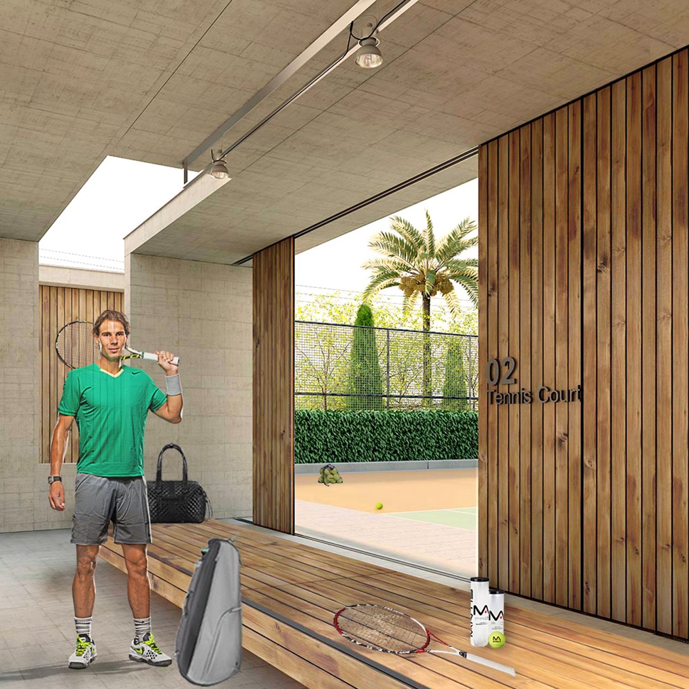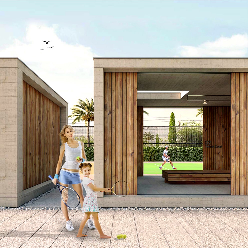 Two lighting towers separate the building mass into three compartments, allowing for a continuous line of sight across both tennis courts.